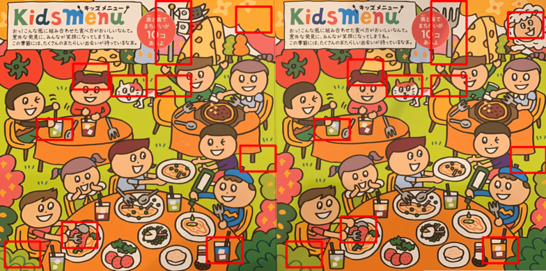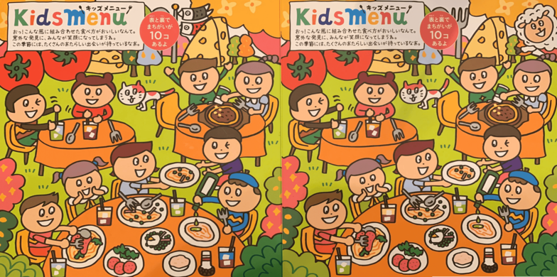 サイゼリアの間違い探し答え合わせサイゼリヤのキッズメニューでおなじみの「間違い探し」。サイゼリヤ自慢の食材紹介と共に「間違い探し」を掲載していきますので、ご来店の際は、ぜひチャレンジしてみてください。 答え